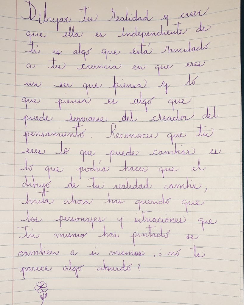 Dibujar tu realidad y creer que ella es independiente de tí es algo que está vinculado a tu creencia en que eres un ser que piensa y lo que piensa es algo que puede separarse de creador del pensamiento. Reconocer que tú eres lo que puede cambiar es lo que podría hacer que el dibujo de tu realidad cambie, hasta ahora has querido que los personajes y las situaciones que tú mismo has pintado se cambien a sí mismos, ¿no te parece algo absurdo?